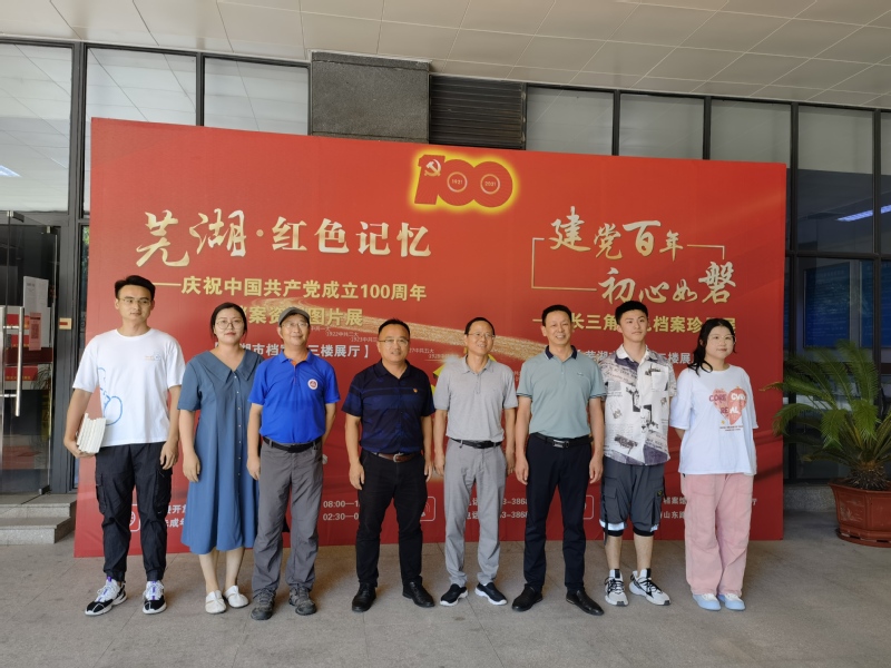 8月30日下午,校团委书记郭广春、经济与管理学院党委副书记章兵、程繁、院团委副书记赵恒梅来到芜湖市档案馆,看望慰问正在这里开展社会实践的学生。芜湖市档案馆馆长陶泰山,办公室主任张照军,开发利用科科长徐玲芝等陪同参观《芜湖·红色记忆——庆祝中国共产党成立100周年档案资料图片展》