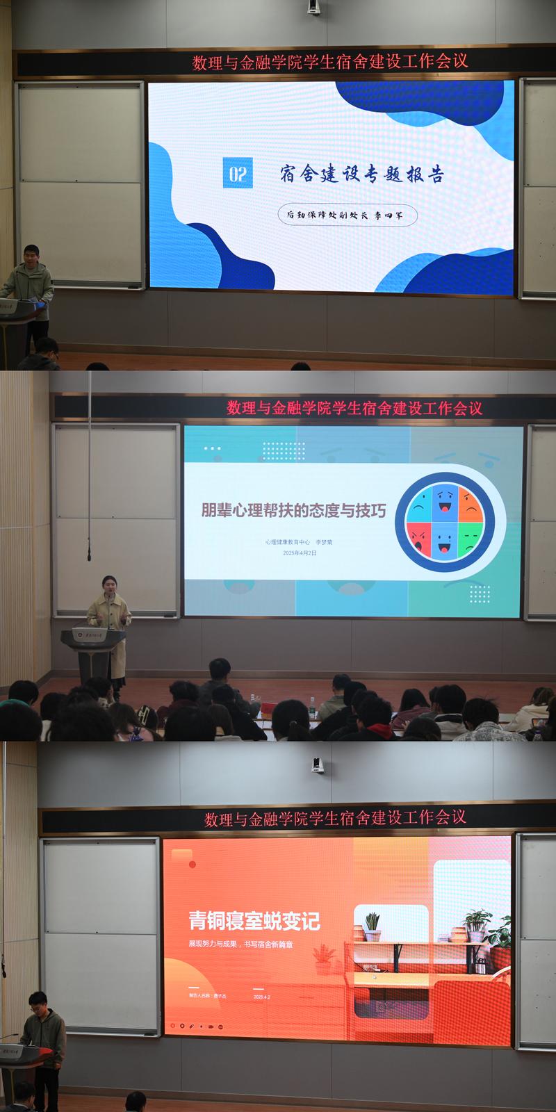 为深入推进学生宿舍建设,夯实宿舍育人阵地,4月2日,数理与金融学院在2教报告厅召开学生宿舍建设工作会议。学校后勤保障处副处长李四军、数理与金融学院党委副书记何志恒、心理健康教育中心李梦菊和各年级辅导员、班长、团支书及寝室长参加会议。